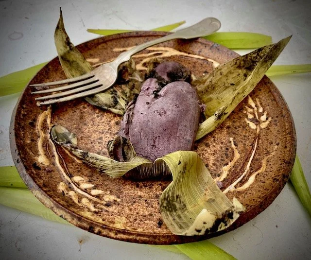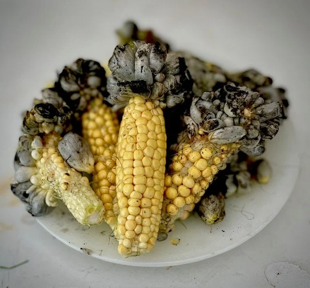 The huitlacoche grows every year where plants are stressed or damaged, a spore working its way into each kernel as it develops and turning it into a silvery fruiting body that soon explodes with its own spores. They are a mysterious presence, a reminder of the cyclical and interdependent nature of all things. It’s a fungus like any other mushroom. An exotic and umami delicacy or a scourge to corn farmers. I love the way that it colors everything that it touches with it’s darkness, including tamales. I really love hunting for it, walking along the edges of fields and down rows, looking for telltale signs of stress or damage to the stalks. Hitting a pocket where it’s taken hold, sometimes yielding a few clusters and sometimes one or two and sometimes many. I always ask them if they want to be picked, and always leave some behind. If hunting and harvesting wild food is approached as a contemplative practice, the plants will speak to you. The huitlacoche always has a lesson for me, a story; it’s not just food. Today it told me that it’s important to understand that time isn’t always linear. It readjusted my perspective.